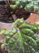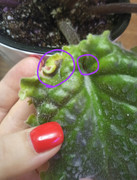 Аккуратно раздвиньте листья в центре розетки и осмотрите точку роста (самый центр, откуда появляются новые листочки) и основание черешков.
